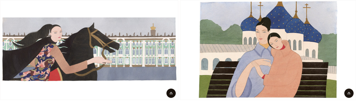 그녀의 패션 일러스트레이션으로 잘 알려진 미국 예술가 켈리 비먼의 스타일은 자유로움이 특징입니다. 깨끗하고 검은 선, 색상 필드, 평평한 원근법, 아주 세밀하게 작성된 세부 사항만으로 극단으로 단순화 된 형태. 남성적이고 길쭉한 갈색 머리의 주인공은 황홀하고 그림자가 없는 얼굴로 역사적인 러시아 도시를 탐험합니다.