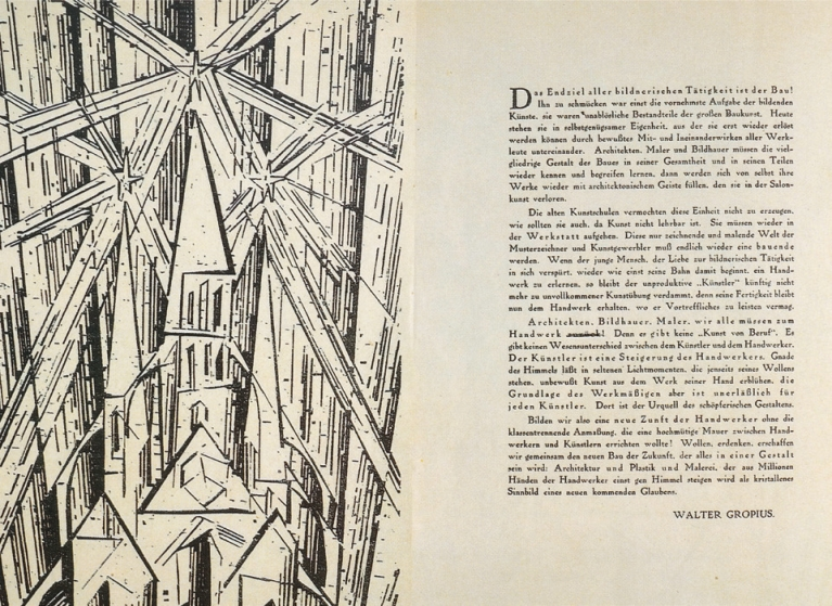 공예가와 예술가 사이에 교만한 장벽을 세우고자 했던 계급차별의 오만함을 제거한 수공예가들의 새로운 조합을 세우자! 먼 훗날 새로운 신앙의 빛나는 상징으로 수백만의 수공업자의 손으로부터 하늘로 올라갈 형태(Gestalt) 그리고 건축과 조각과 회화, 이 모든 것이 하나의 형태가 되는 새로운 미래의 건설을 우리 모두 함께 희망하고, 상상하고, 이뤄내자.”