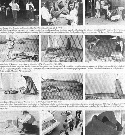 갤러리 바닥에 건초더미, 펠트천, 월스트리트 저널 등을 깔아 놓고, 그 곳에서 코요테와 3일 동안 생활했다.