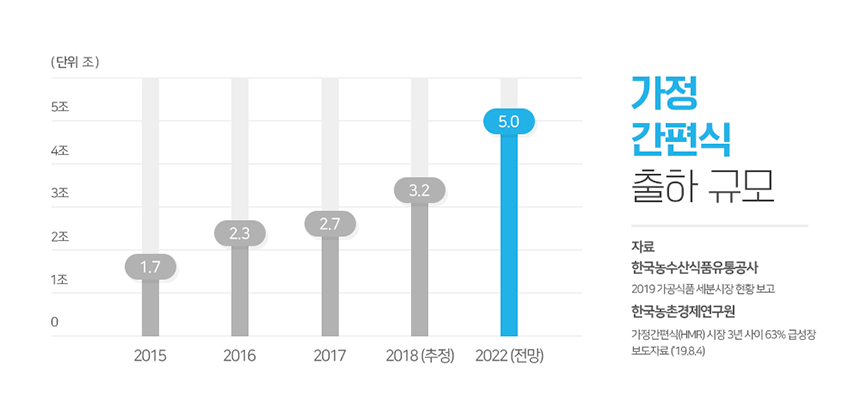 홈코노미 트렌드에서 각광을 받고 있는 제품군 중 하나는 바로 밀키트다. 밖에서 외식을 하는 대신 집에서도 레스토랑에서 외식하는 기분을 낼 수 있는 밀키트와 간편식 제품에 대한 수요가 크게 늘었다. 농림축산식품부의 최근 조사 자료에 따르면 2013년 1조6000억원이었던 가정간편식 (HMR: Home Meal Replacement)시장 규모는 2022년에는 5조원 이상으로 성장할 전망이다.