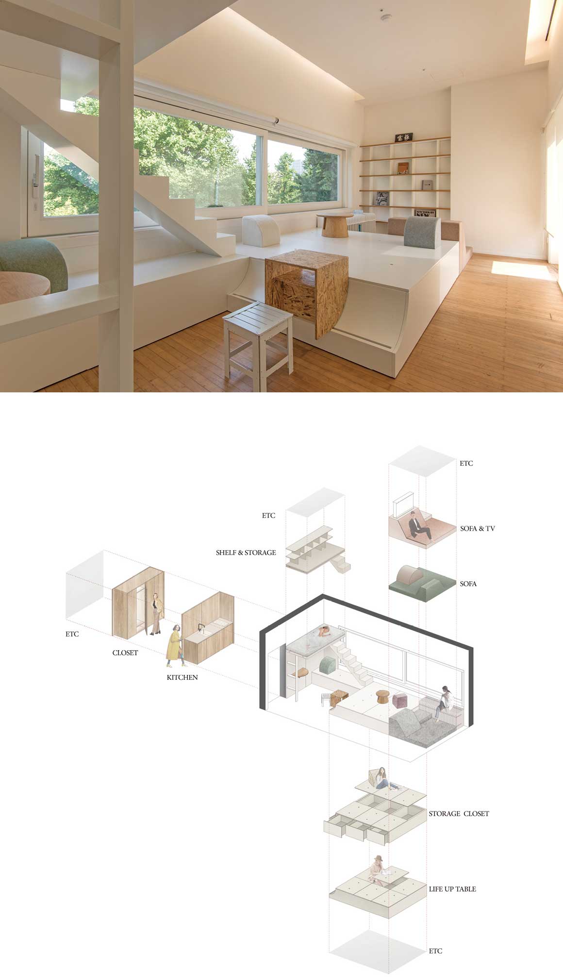 최윤성(재단법인 아름지기 아트디렉터)은 키가 큰 가구들인 수납장, 파티션, 의자 등을 수평적으로 전환해 공간의 효율을 높인 ‘바닥을 꽉 채운 공간’을, 디자이너 최종하는 평면으로 납작하게 접을 수 있는 소반과 의자인 ‘디-디멘전’ 시리즈와 전통 좌구의 개념인 등·탑·상을 기반으로 한 ‘ㄷㅡㅇ, 등’을 선보인다. 바닥이라는 건축의 기본요소를 입체화함으로써 얻을 수 있는 다양한 가능성에 대해 재고하는 작품이다.