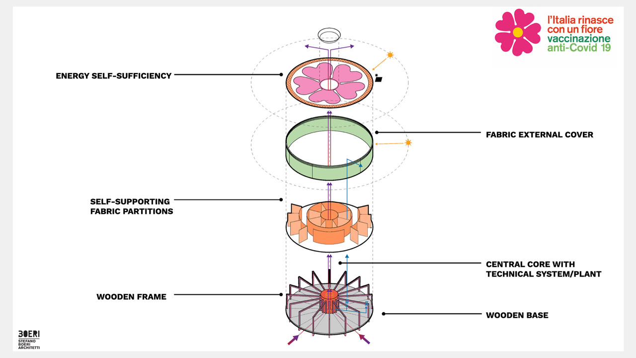 “봄꽃의 이미지를 통해 우리는 재탄생과 화창함이라는 상징을 전달하는 건축물을 만들고 싶었다. 백신을 맞는 일은 시민으로서의 책임이 될 것이며 이웃을 사랑하고 삶을 재발견하는 일이 될 것이다. 바이러스는 우리를 병원과 집 안에 가두었지만, 백신은 우리를 둘러싼 생명과 자연에 다시 닿게 해줄 것”이라고 보에리는 말한다.