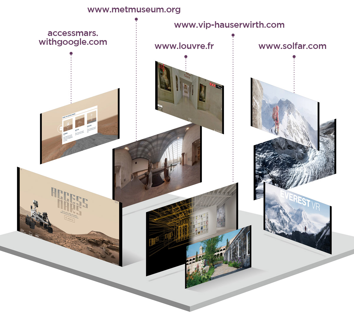 하우저 & 워스 갤러리는 아트랩 팀과 협력해 2021년에 공개할 메로나섬 하우저 & 워스 갤러리를 통째로 가상 세계로 옮겼다. 가상현실 전시회도 열었는데, 빼어난 경관을 자랑하는 건물 정원과 안을 둘러보며 루이즈 부르주아, 마크 브래드퍼드, 제니 홀저 등의 작품을 관람할 수 있다. 앞으로 우리는 어떤 여행을 하게 될까? VR은 안방에서도 여행을 할 수 있도록 도와준다.