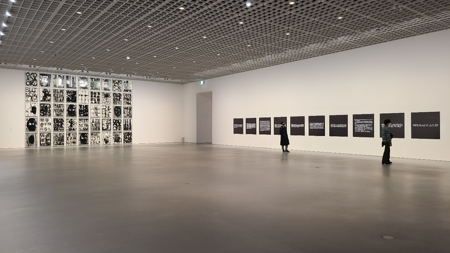 아담 펜들턴의 <나의 구성요소들>은 작가의 연작 중 규모가 가장 큰 작품으로, 전시실 한쪽 벽면을 가득 채운다. 흑백으로 실크스크린 된 이 작품은 아프리카 조각과 마스크 이미지, 작가가 직접 쓰거나 차용한 글귀, 기하학적 도형들이 중첩되며 강렬한 메시지를 전달한다.