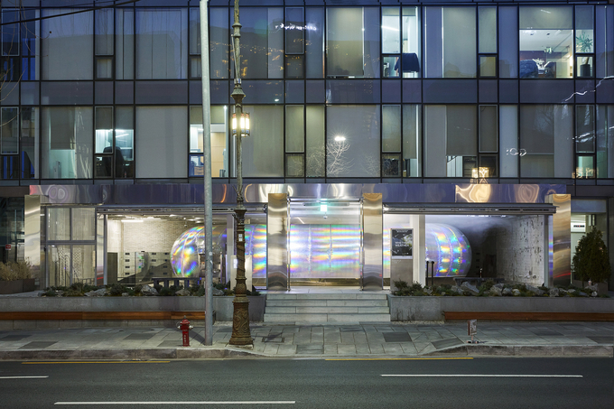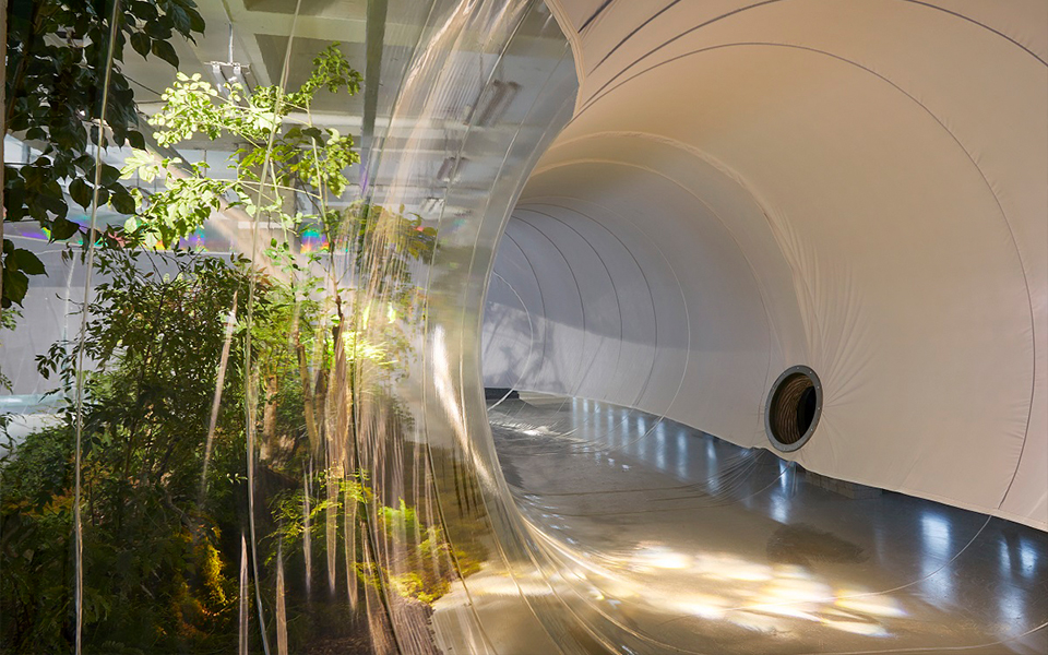 홀로그램의 은색 소재는 100% 재활용된 나일론이라고 한다. 또한 홀로그램과 연결된 투명 비닐은 작품 밖에서 안에 있는 방문객의 움직임을 들여다 보며 흥미를 느낄 수 있게 하며, 구조물 안까지 연결되어 자연 공간을 열어주고 있다.