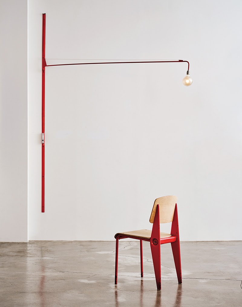 디자인은 모두가 사용할 수 있어야 함은 물론 실용적이어야 한다고 믿었던 장 프루베는 제작과 이동, 설치하는 작업 또한 간편해야 한다고 생각했다. 여타의 장식을 배제하고 심플함을 살린 포텐스 램프 Potence Lamp는 벽면에 설치하는 방식으로 제작되어 공간 활용이 용이할 뿐 아니라 설치 또한 쉽다. 함께 놓인 붉은색 세미메탈 체어도 조립과 분해가 가능하도록 설계됐다.