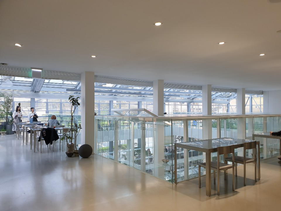 1층은 내부 온실과 음료를 주문할 수 있는 바, 테이블 등으로 구성되어 있습니다. 야외에는 작은 사이즈의 이끼 정원이 조성되어 있고, 온실 지붕은 개폐가 가능하여 공기가 순환할 수 있도록 하였습니다. 구름 다리와 카페테리아 형식의 2층을 지나면 3층엔 갤러리가 있는데요, 3층 한쪽 벽면에 큰 창을 내어 대모산 자락도 작품처럼 감상할 수 있습니다. 3층에서는 정기적으로 다양한 전시와 식물 클래스를 진행할 예정이라고 합니다.