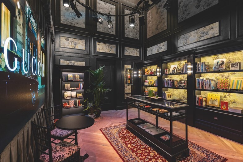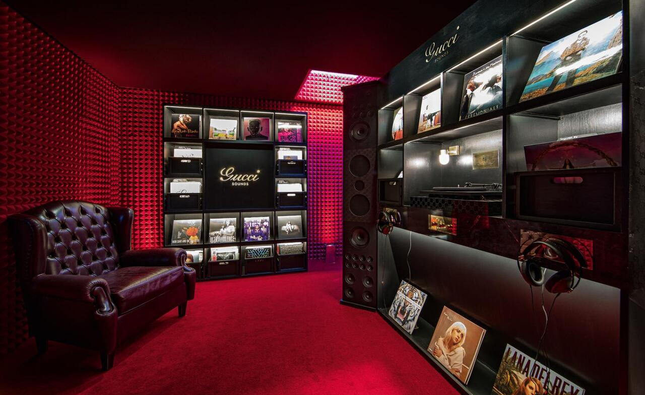 공간의 첫 터치포인트는 알레산드로 미켈레(Alessandro Michele)가 하우스 100주년을 기념하기 위해 만든 '구찌 100' 컬렉션이다. 화려한 재료로 디자인된 리미티드 에디션 어페럴들은 구찌의 '글레이드 프린트' 벽지를 아우르는 우아한 내부공간 안에 전시된다. 또한 도버스트리트 마켓 기반으로 레어 패션, 미술, 사진, 서적 등을 소장하고 큐레이션하는 컬트 출판사 IDEA 와의 협업으로 만들어진 라이브러리는 눈여겨 봐야할 요소이다. 라이브러리로 꾸며진 공간에는 벽에는 빈티지 컬렉션들이 진열되어 있고 미국 사진작가 브루스 길든과 크리에이티브 디렉터 미켈레의 특별 합작품인 Beat & Blow By The Wind를 포함해 한정판 구찌 북들이 다양하게 쇼케이스 되어 있다. 또한 미켈레의 애장품, 서적 그리고 다양한 포스터들은 중앙 유리박스에 담겨 전시되어 있다. 공간의 다음 경험은 피비 브리저스(Phoebe Bridgers), 셀레스트(Celeste), 빌리 아일리시(Billie Eilish), 알로 파크스(Arlo Parks) 등 다양한 아티스트의 트랙을 선택해 직접 선곡하고 들어볼 수 있는 사운즈 룸이다. 레드 조명 아래 좋은 사운드 시스템 바탕으로 구찌와 관련된 엘피들이 전시되어 있고 방문객들은 해드폰으로 마음에 드는 바이닐을 선택해 들어 보며 브랜드 경험에 완전히 몰입하게 만든다.