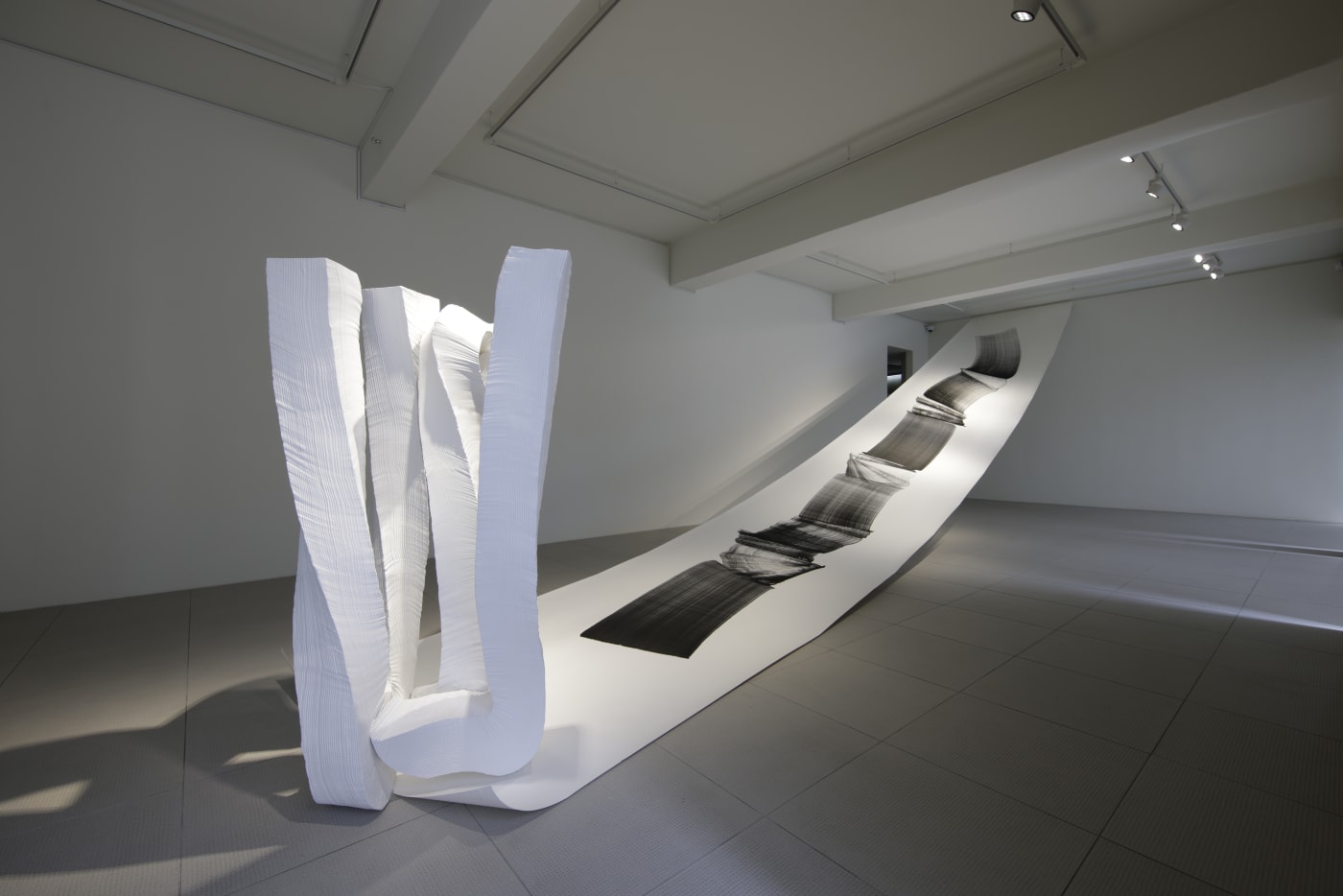 이배의 숯은 1000도와 1100도 사이의 가마에서 2주간 태워지고 2주간 식혀진다. 불이 지나간 자리엔 나무 고유의 모습과 향 대신 보편적이고 추상적인 형태가 남는다. 이렇듯 단순해진 외형의 내면에는 뜨겁게 지나간 불의 자리와, 그 이후 연장된 시간의 영속성이 담긴다. 숯의 보편성과 영속성을 변주하듯, 아크릴 미디엄 작품 위로 글씨인 듯 그림인 듯 양의적인 형상이 부유한다. 그려진 형태 위로 반투명 아크릴 미디엄을 바르고 말리기를 세 번 반복하는 과정을 통해 화면에 공간이 만들어지면서 형상은 흐릿해진다. 이는 회화의 환영을 그려내고 실재의 재현 불가능성을 표현하기 위해 고의적으로 형태를 흐리게 그린 추상표현적 변환을 연상시킨다. 다만 재현의 불가능성을 띄는 요소들이 이미지의 근본적 실재에 대한 반영과 부재를 탐구하는 동안 물질적 유한함에 종속되어 왔다면, 이배의 숯 모티브는 시간의 영속성과 어둠 이면의 빛을 나타낸다는 점에서 자유롭다.