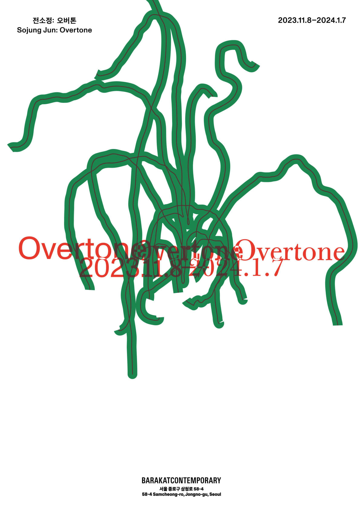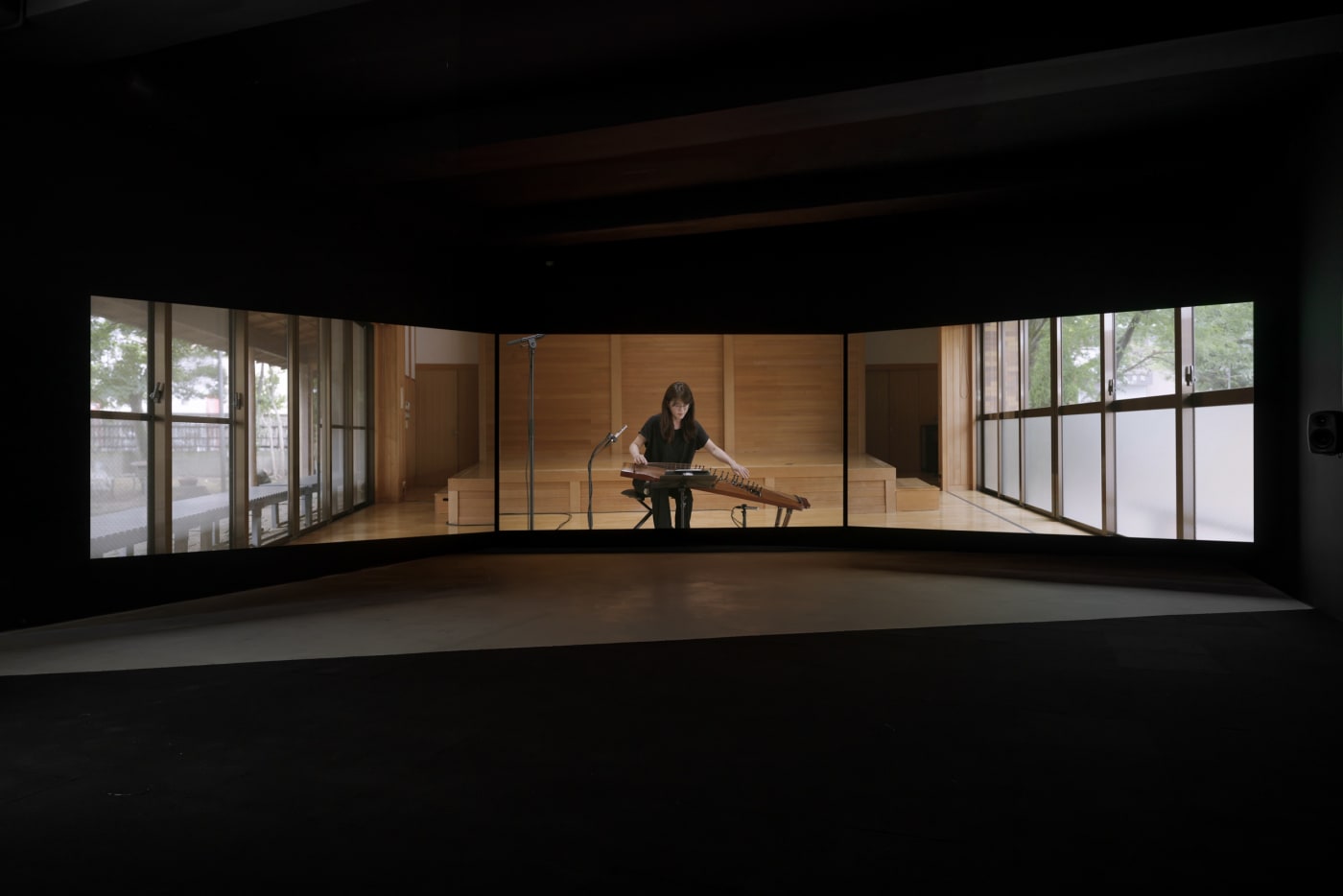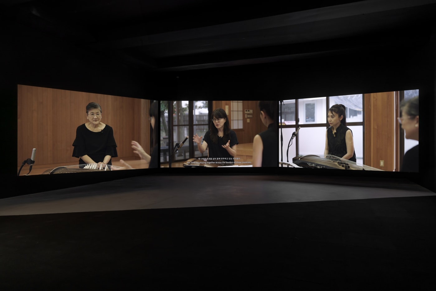 국립현대미술관이 꼽은 ‘올해의 작가상 2023’ 후보자 네 명 중 한 명인 전소정은 서울 소격동 바라캇컨템포러리에서 개인전을 열며 이곳에서도 타인의 소리에 주목한 3채널 영상 ‘오버톤’을 메인 작품으로 내놨다. 소리 하나만을 따라 남북을 가로질러 이동한 가야금 연주자 박순아의 여정에 영감을 받아 만든 작품이다. 한국과 독일, 과테말라에서 활동하는 세 명의 작곡가가 각각 가야금, 고토, 고쟁을 위한 곡을 만들어내는 1시간30분가량의 영상을 세 개의 패널에 담았다. 세 개 화면은 전부 크기가 다르고 어긋나게 배치됐다. 관객이 앉아서 관람할 때 어느 화면에 집중하는가에 따라 이야기의 중심이 달라진다.