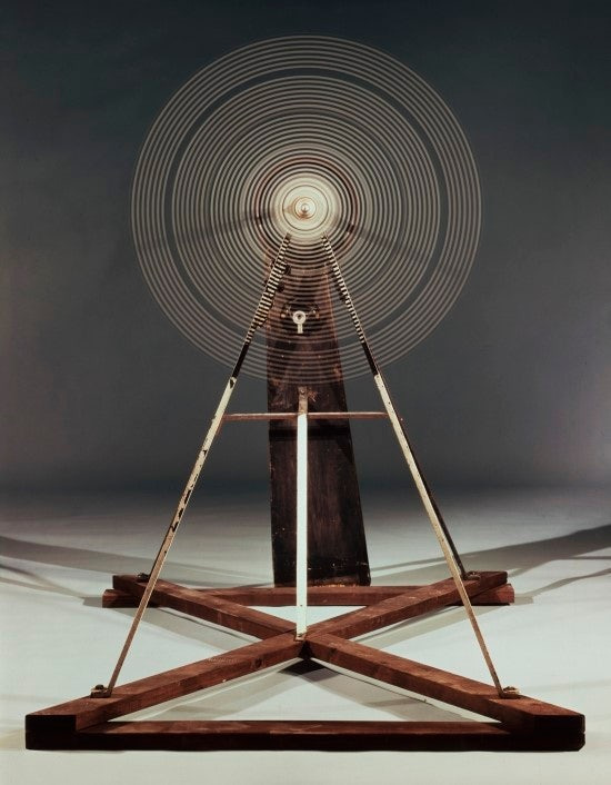1920년 마르셀 뒤샹(1887~1968)은 과학기술을 도입한 최초의 예술작품으로 <회전판>을 선보인다. 키네틱 아트(Kinetic Art)의 선구자로 꼽히는 마르셀 뒤샹의 <회전판>은 시각적인 효과를 높이기 위해 반복된 곡선들을 입체적인 구조물 위에 그려놓고 전기장치를 이용해 실제로 움직일 수 있게 하였다.