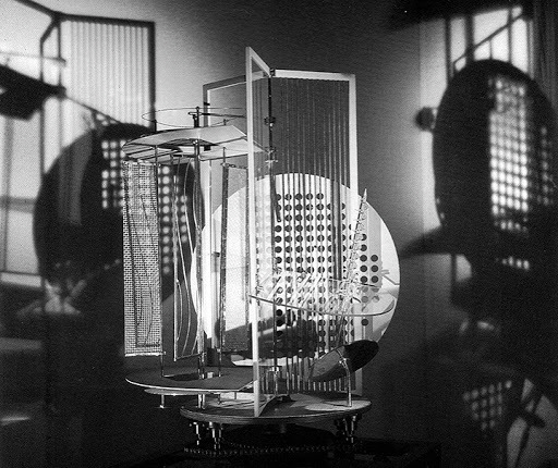 헝가리의 화가이자 사진작기인 라즐로 모홀리-나기(1895~1946)는 예술을 수학적이고 과학적인 영역으로 끌어내고자 했다. 과학이 많은 것을 해결해줄 것이라고 믿었던 시대의 일원인 그는 새로운 기술을 모르는 것은 시각적 문맹과 다를 바 없다고 보았다. 빛을 물감을 대체할 새로운 예술매체라고 생각한 그는 8년간의 실험 끝에 일종의 움직이는 조각 작품 <빛-공간 변조기>를 발표하였다. 구멍이 잔뜩 뚫린 크고 작은 원판들, 수직으로 떨어지는 줄, 망, 선 끝에 매달린 작은 공 등이 어우러져 계속 움직일 때, 빛은 끊임없이 오브제의 틈을 통과하고, 부딪히면서 또 다른 빛과 그림자를 만든다. 작가는 ‘빛 투사기-흑색, 백색, 회색’이라는 기록영화에 ‘빛-공간 변조기’의 작동 장면을 담았다.