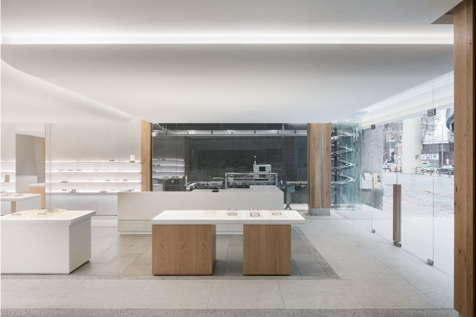 그들은 편하게 쇼핑할 수 있는 환경에 드라마틱한 감성을 자아내도록 조명으로 많은 시도를 했는데요, 안경 제작을 기다리면서 차 한잔을 잠시 즐 길 수 있는 카페테리아에서 그 드라마틱한 감성을 물씬 느낄 수 있습니다.