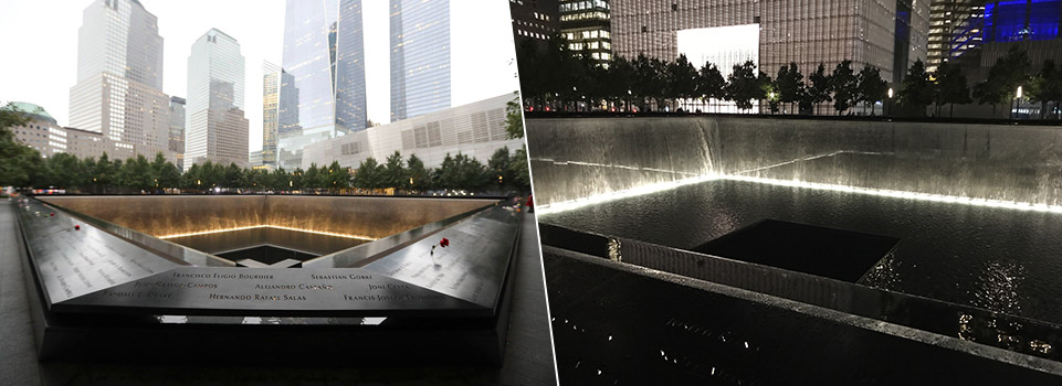 원래 두 개의 쌍둥이 건물이 있던 곳에 테러로 인해 흘린 유가족들과 미국인의 눈물을 상징하는 안으로 떨어지는 폭포를 설계하였고, 폭포의 테두리에는 희생자들의 이름이 모두 새겨져 있습니다. 또한, 희생자들은 가족, 직장 동료 등 서로 연이 있었던 사람끼리 모아져 있어, 유족들이 기억을 되살리는 것을 돕도록 했습니다.